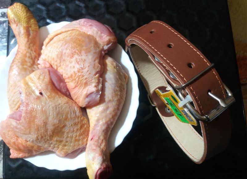 Зато Кейси весьма уважает варёную курицу! А хозяева балуют редко. Поэтому в прошлом году мы купили курицу на день рождения собаки, сейчас тоже долго не думали. Отличный подарок! Плюс новый ошейник, потому что старому почти 7 лет. Обычный, двойной кожаный, безо всяких прибамбасов.