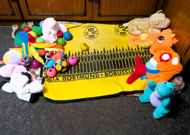 С возрастом выбрала для себя исключительно мягкие мячики, чтобы с дырочкой и легко сжимать пастью, второе в приоритете — тоже мягкие звери. Остальное добро лежит бесполезной грудой. Канаты, перетяжки, пищалки, прочие мячи в неимоверном количестве, плотные резиновые зайцы-ёжики-гантели — полная коробка. Часть уже вынесли на улицу другим собакам, кулёк в момент разобрали. В общем, игрушки не нужны, хотя Кейси вовсе иного мнения.