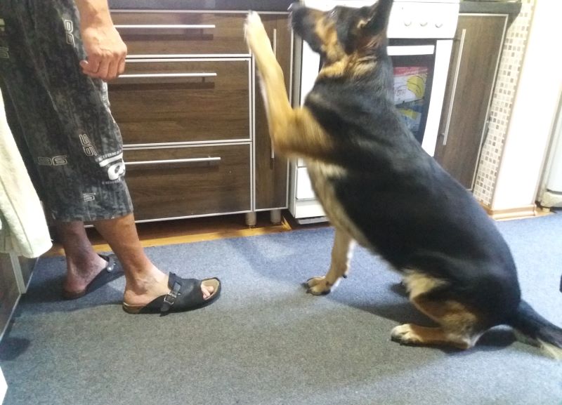 Но слишком, чересчур медленно хозяин угощал редким лакомством! Поэтому Кейси показала, что умеет давать лапу. И даже по команде «раз» — правую, а на «два» левую. Дрессированная собака! Безусловно, заслужила поощрение.