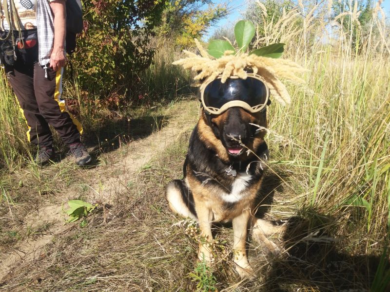 Дошли до места отдыха. Сняли с Кейси очки. Единственное, что праздничный день омрачало — солнце. Чудесное и ласковое, но глаза Кейси приходится защищать — аллергия на солнце, кератит овчарок.