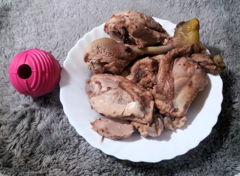 На самом деле, в обычную кашу с овощами положили курицу. Разумеется, без костей, одно мясо срезали. Варёные кости вообще нельзя давать собакам, а тем тем более трубчатые куриные.