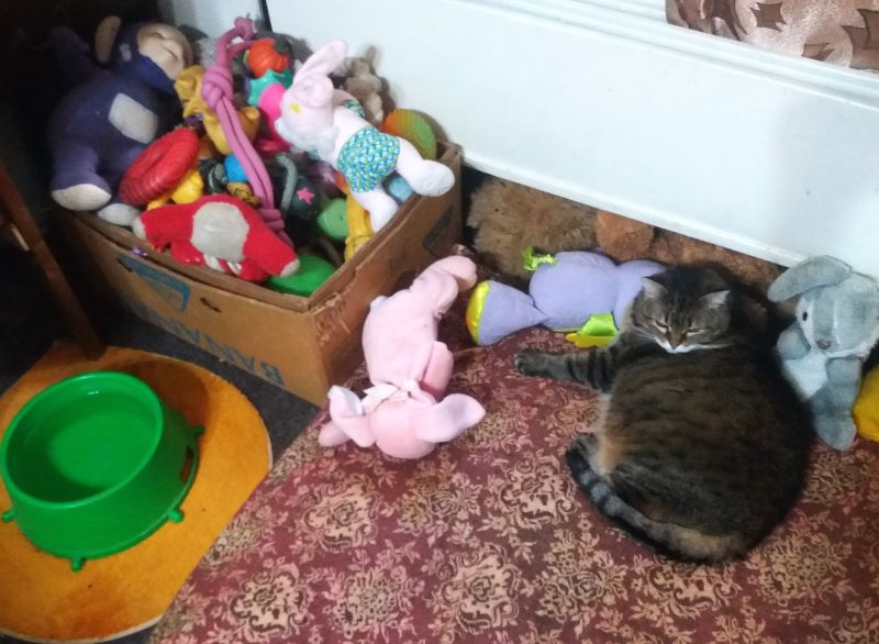 Дальше виновница торжества спала и даже дрыхла. Но это не всё! Курочку дали ещё днём, а затем вечером! Играли в новый мяч, в котором внутри звенит колокольчик. Сто первый мяч по счёту — ну и что? Главное, именинница довольна.