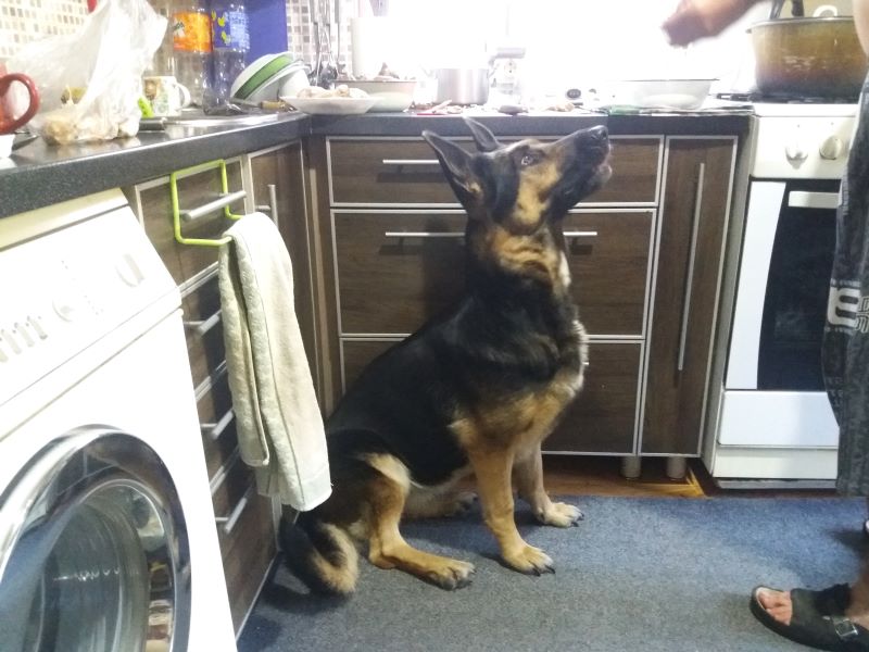 Нет, собака не попрошайка! Обычно лежит в коридоре, пока миску готовят. Иногда приходит, сидит рядом, следит за процессом и получает маленькие кусочки мяса, пока хозяин остальное режет. Просто сидит собака и вовсе ничего не просит.
