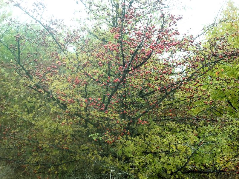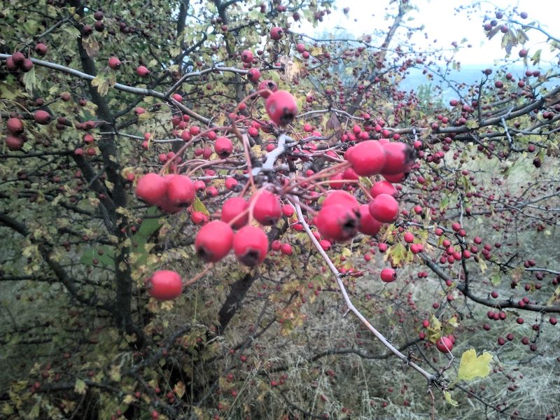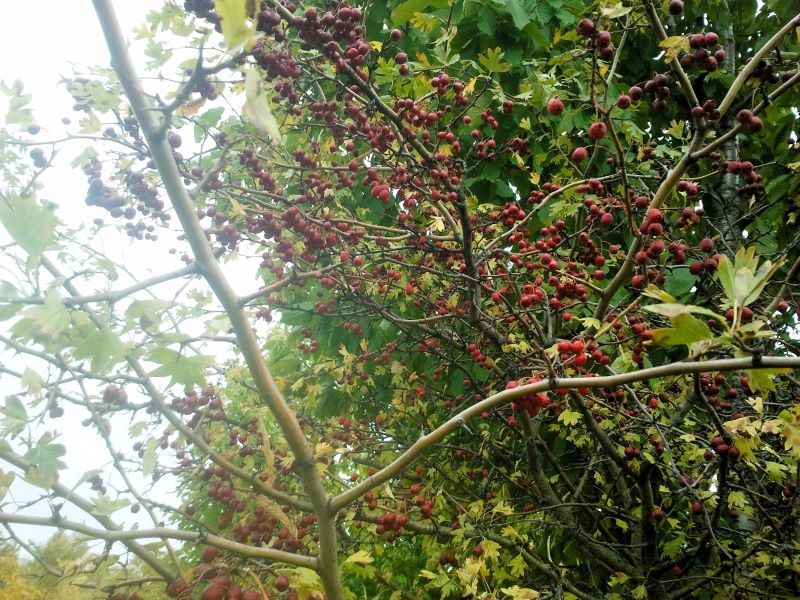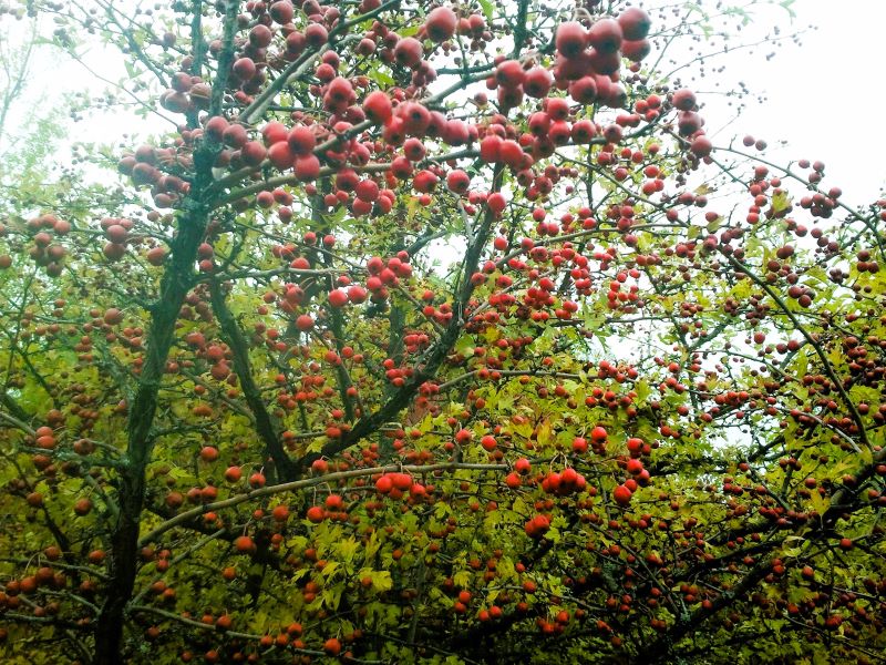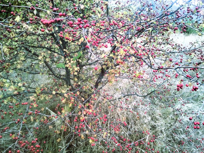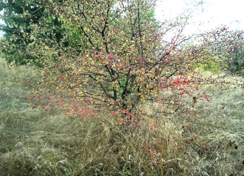 А дальше полно деревьев боярышника, одно другого красивей. В первый год, когда с Кейси сюда дошли, вдруг увидели единственное с неизвестными красными ягодами. Даже не знали, что это. Погуглили, оказался полезный боярышник. Тряслись над каждой ягодкой, потому что не нашли больше никаких деревьев. С тех пор прошло шесть лет. Боярышника на поле видимо-невидимо, который абсолютно никто не собирает, хотя за шиповником люди приходят.