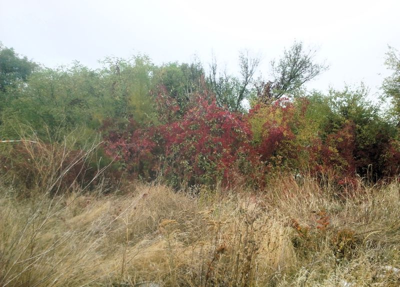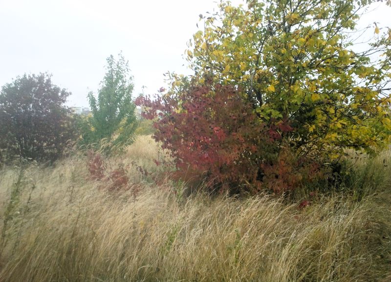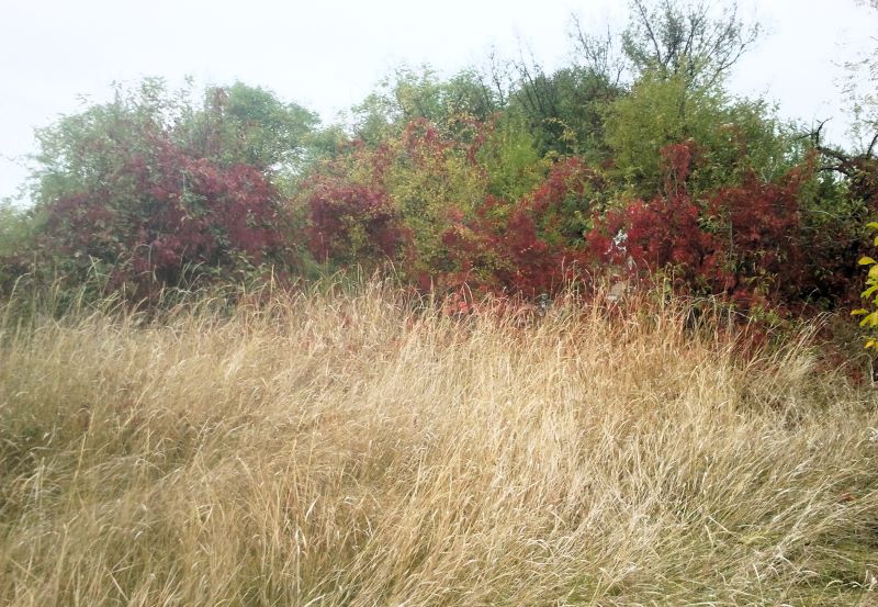 А по дороге и мы набрались впечатлений — это дикий виноград с красными листьями. Вскарабкался вверх по проволоке, которой огорожен заброшенный сад. Последний раз были здесь недели три назад, картина отличалась разительно, просто зелёная стена деревьев и прочих кустов.
