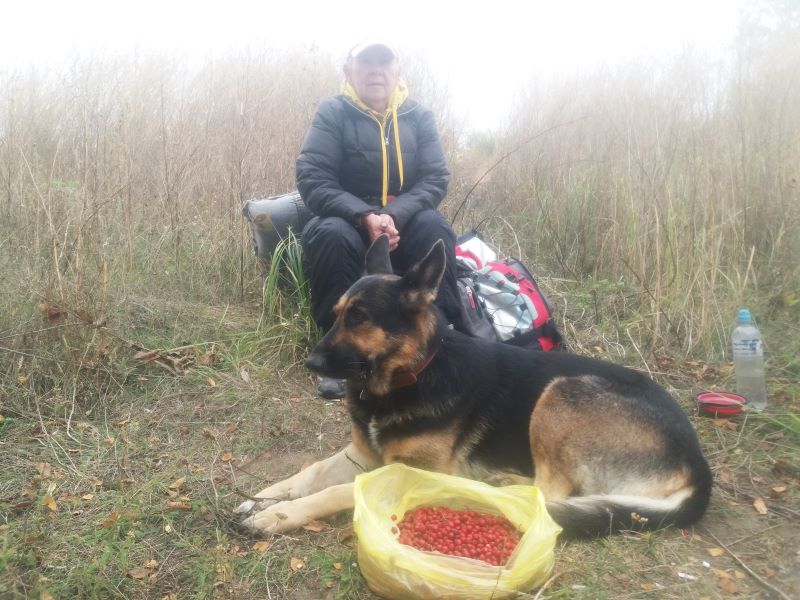 Дошли, сели отдыхать. А температура всего +8 на улице! Скукожилась я даже в пуховике, поэтому долго не усидели. Кейси удивилась. Привыкла за лето, что располагались основательно, здесь вдруг подпрыгнули. На стоянках собака всегда получает вкусности, едва распробовала — хозяева подскочили. Ещё и фотографировали — смотри сюда, смотри туда. Урожай боярышника запечатлели. Один кулёк, второй в рюкзаке.