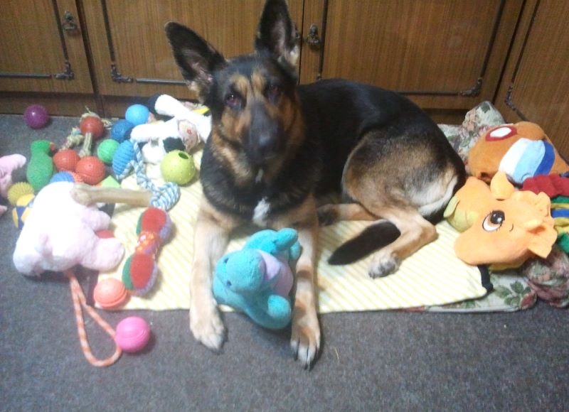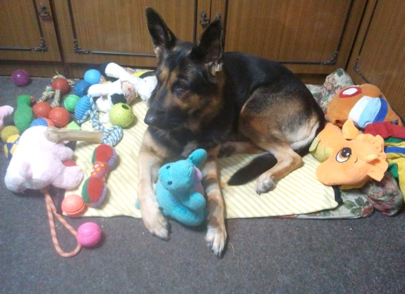 И не играла я с бешеной собакой в мяч? Играла. Затем перетягивали канат и мяч на верёвке. Попутно Кейси нападала на мягкие игрушки, трепала добычу, мотая головой. Вроде устала, пошла было спать. Ан нет! Опять мяч притащила. Но поскольку я грозно сказала: «Всё!» — дальше играла самостоятельно. Бросала, ловила, гоняла по комнате лапами. Затем шаталась, бродила по квартире, с надеждой заглядывала на кухню. Получила сушку и, наконец, угомонилась. Легла на место, схватила плюшевого дракона и задумалась.