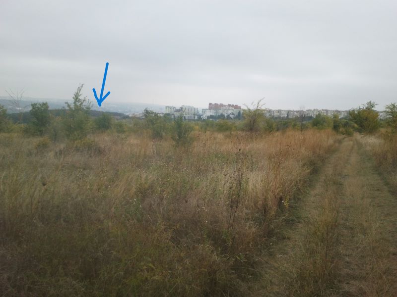 Город вдали. Тёмный массив слева, который горбом выступает (под стрелкой) — лесопарк. Здесь он ещё лес, а парк дальше. Обычно в сторону города фото не выходят, потому что против солнца. Но коли небо затянуто, вполне прилично получилось.