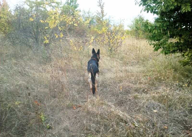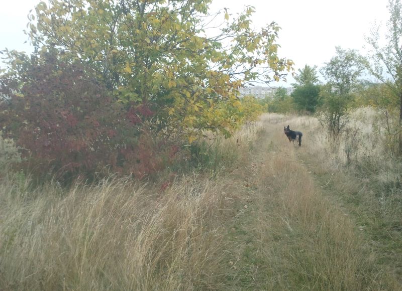 И дальше пошли по буеракам, где Кейси гоняла непуганых фазанов. Клещей пока не встречали (ттт), хотя думали, что даже не сунемся осенью в заросли донника. Вроде ничего. Единственное, что собаку вообще не видели, едва сворачивала с дорожки. Уходила на охоту и пропадала напрочь среди высоченных сухих стеблей. Благо, что быстро возвращалась.