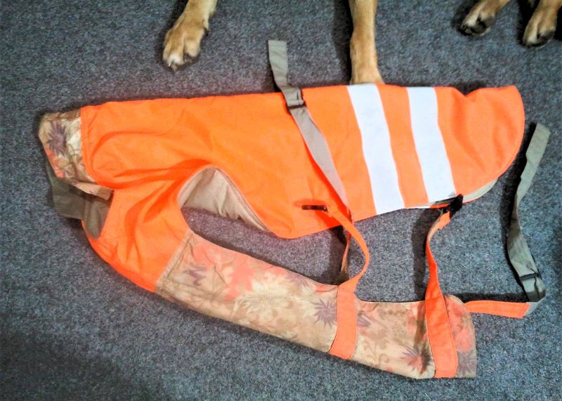 Такая у нас жилетка, тёплая и не промокает. Подруга сшила две штуки ещё для прежней овчарки Тигры. Лапы здесь Кейси.