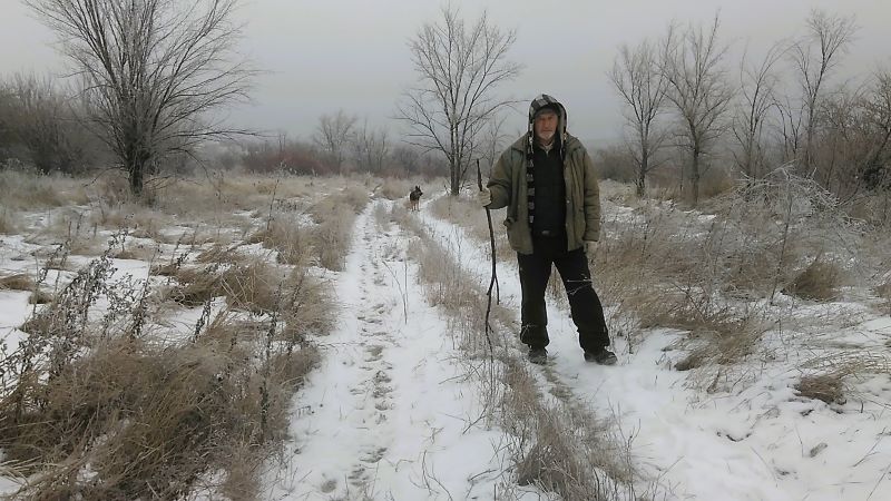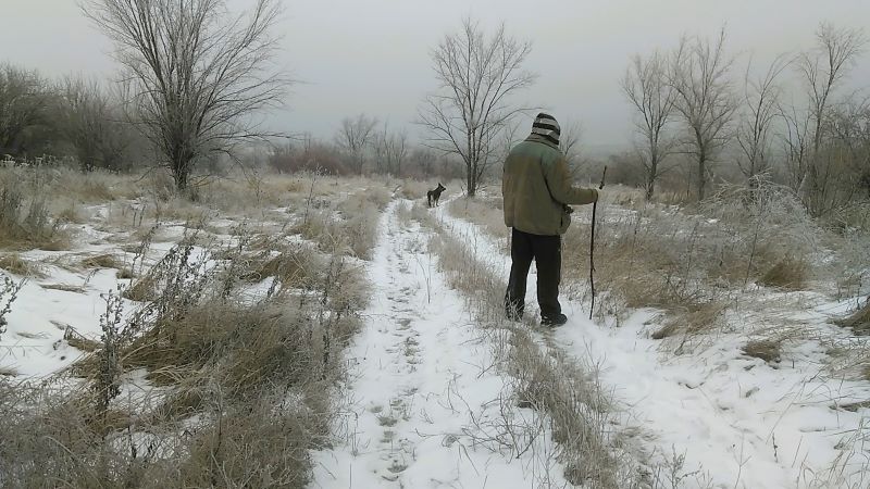 И тихой сапой добрались мы к началу маршрута. Наледь блестела уже и на куртках, и снежинками на шерсти собаки, которую возле шоссе пристегнули к поводку. Свернули с привычной дороги под ореховые деревья, где трава, поскольку сообразили, что иначе не пройдём.