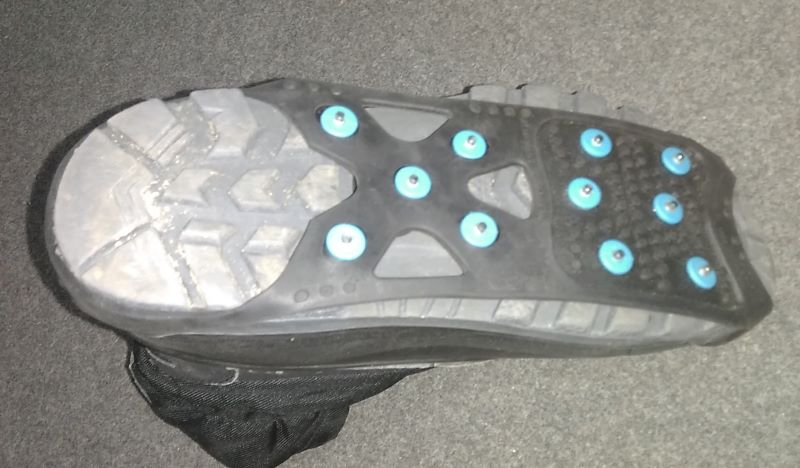 И теперь достала. Муж после прогулки всегда выходит во двор кормить птиц, а мы едва доскользили до подъезда. Поэтому решили штуку попробовать. Муж натянул на подошву одной туфли, сказал, что хватит пока.