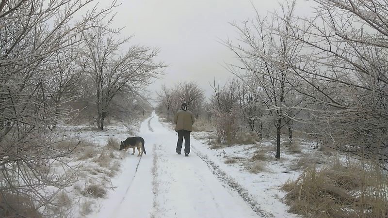 Вечером на голый лёд выпал снежок. Вроде не столь скользко, поэтому решили вдвоём вывести, наконец, собаку на поле. Картину ожидали гораздо лучшую. Правда «коровами на льду» побывали перед первым грандиозным гололёдом. Вообще не предполагали страсти, спокойно пошли гулять. Вернулись домой и в момент вспомнили, что где-то в ящике давным-давно лежат ледоступы, которые сроду не надевали. Нашли, приспособили. Теперь шипы взрызались в лёд. Муж шёл уверенно, я шкандыбала.