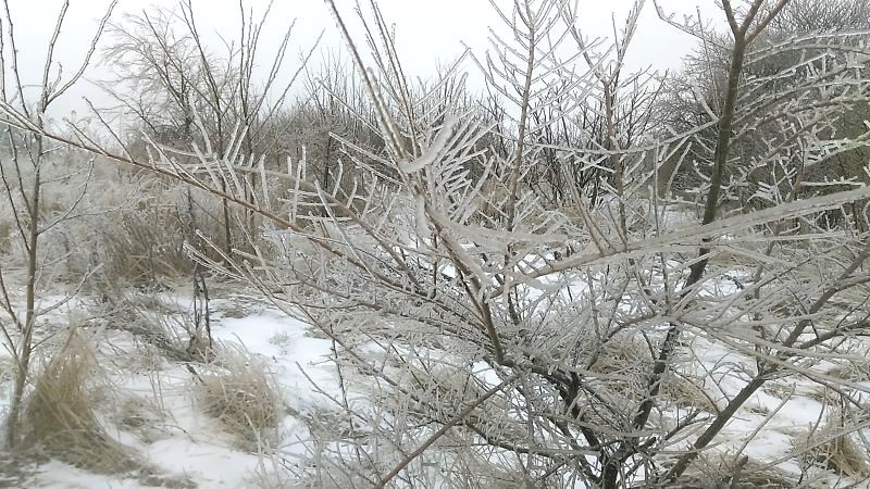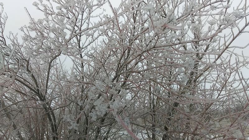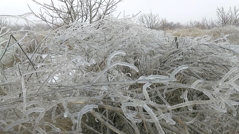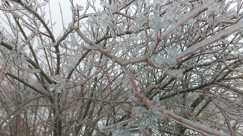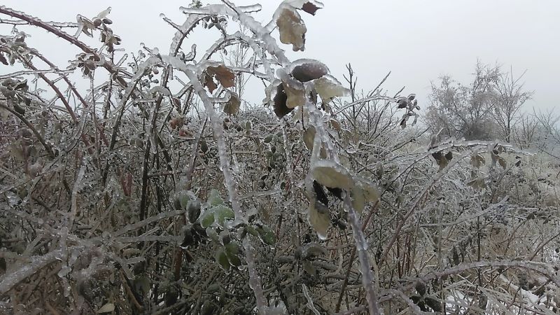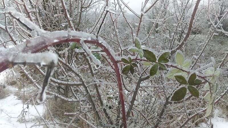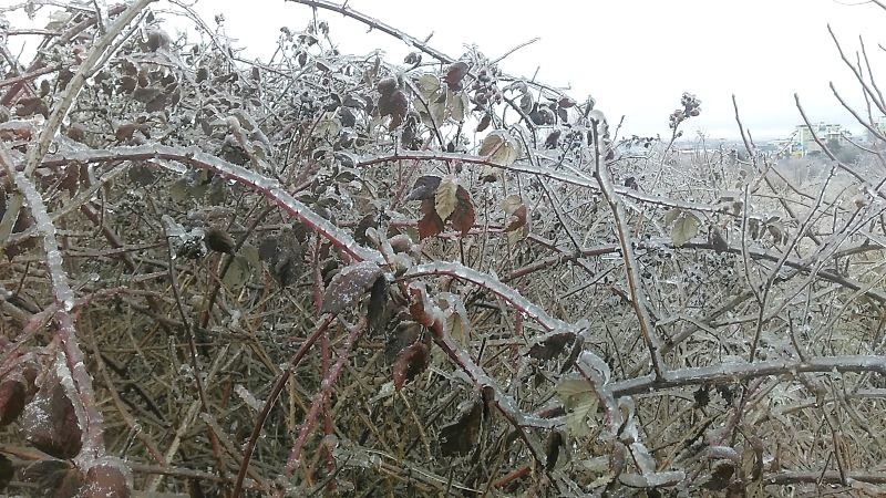 С ежевикой ничего не случится подо льдом, да и с шиповником тоже. Плети у них гибкие, растут быстро. Хотя и на деревьях не видели поломанных веток. Наверное, довольно крепкие, выросли сами по себе. Или времени мало прошло, ледяному панцирю меньше суток. В любом случае не видели. Все стойко и вполне прилично держались.