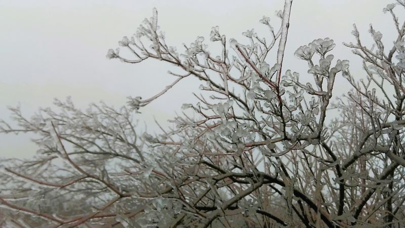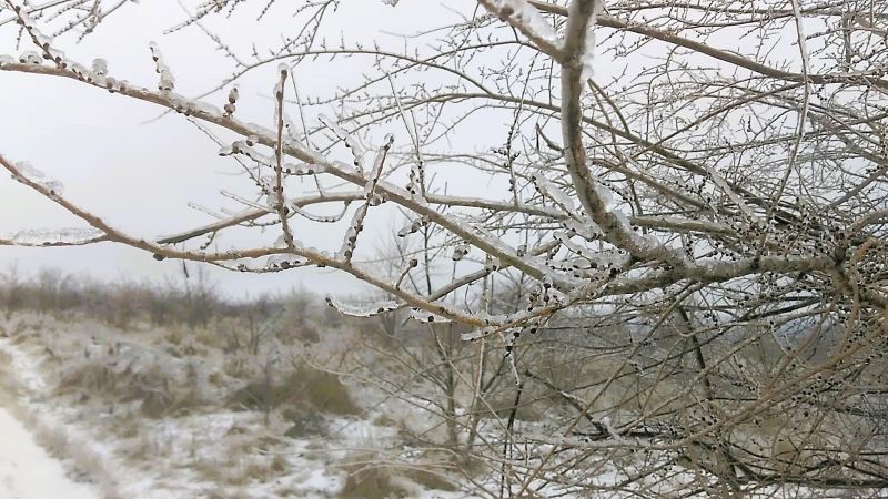 Повернули мы не совсем назад, а по другой тропе и похрумкали ледоступами дальше. Увидели дерево! Странное. Вроде бы с цветочками? Тоненькие отростки на концах веток облепил вкруговую лёд, получились цветы. Неисчерпаема красота и фантазия природы. Никогда в жизни подобной картины не видели! Что за дерево, не знаю. Летом обыкновенное.