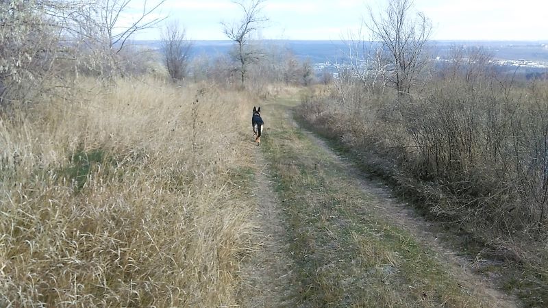 Кейси резво выскочила наверх и сразу подбежала к самому краю. Вновь покорила высоту! Стояла гордо, разглядывала всё вокруг. Последний раз водили сюда собаку в августе, а теперь конец декабря. И гуляла собака по равнине, когда мир столь интересен почти что с высоты птичьего полёта! И Кейси — Королева Горы! Каждый раз панорама явно завораживает. Да и просто интересно побывать в местах, где редко ходим. Ещё и город вдали.