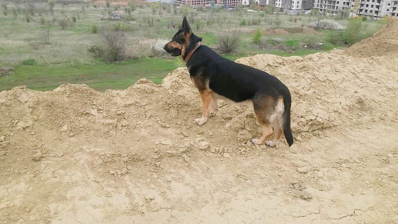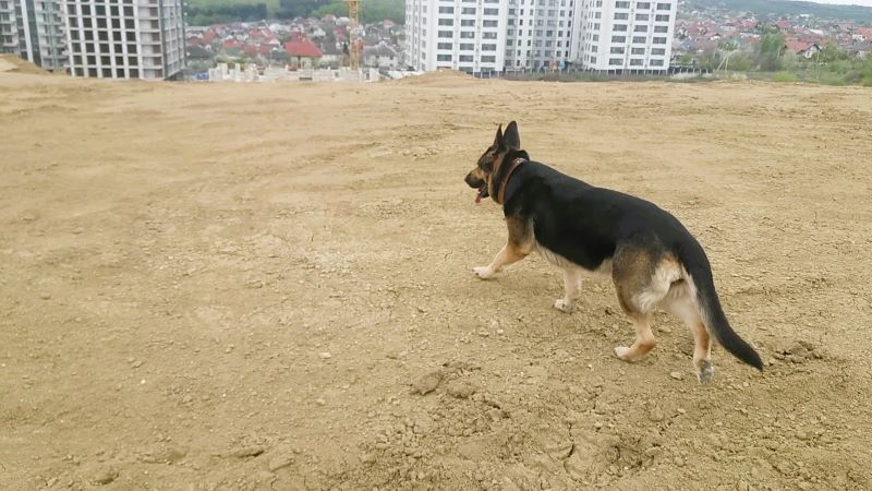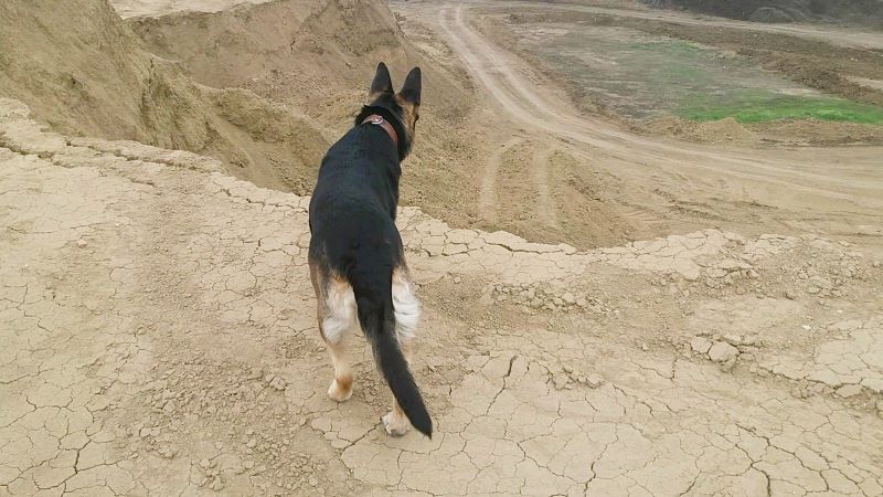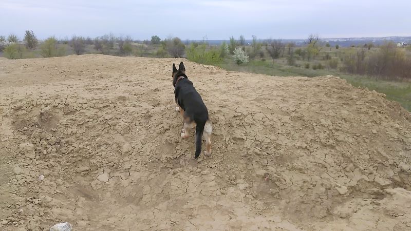 Поднялись на макушку по дороге, которую раскатали самосвалы, насыпая курган. Кейси сразу побежала к самому краю, чтобы видом любоваться. Совсем не боится высоты собака, хотя прежние наши опасались, овчарка Тигра даже по лестнице в подъезде поднималась вдоль стенки. А Кейси наоборот — идёт рядом с перилами, ещё и вниз обязательно смотрит. И с кургана тоже вниз с интересом заглядывает.