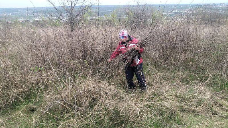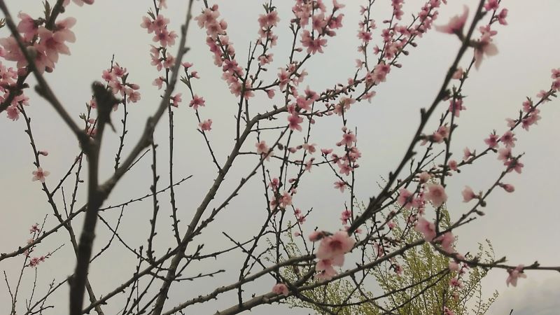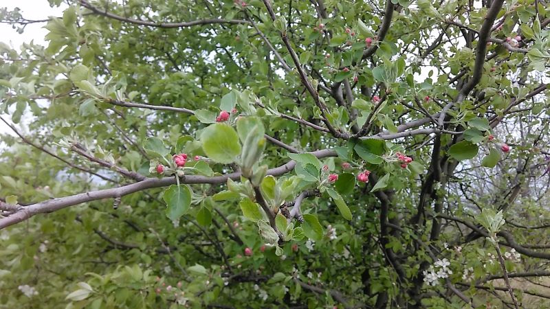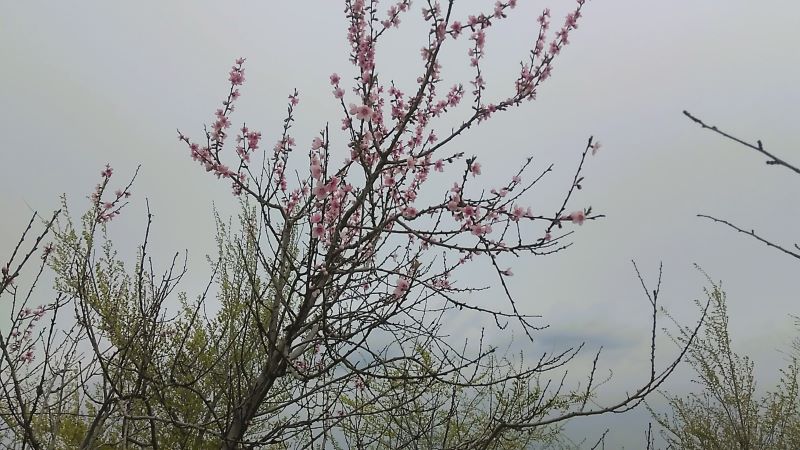Выходили мы на дорожку и вдруг увидели чудо из чудес — розовое дерево. По всему полю уже часть алычи отцвела, вишня ещё держится, и начинают распускаться яблони. Тёрн есть, позже будут шиповник, боярышник, ежевика. В общем, цветы мы видели разные. Но розовое дерево впервые! Что это вообще такое — не знаю. Красиво.